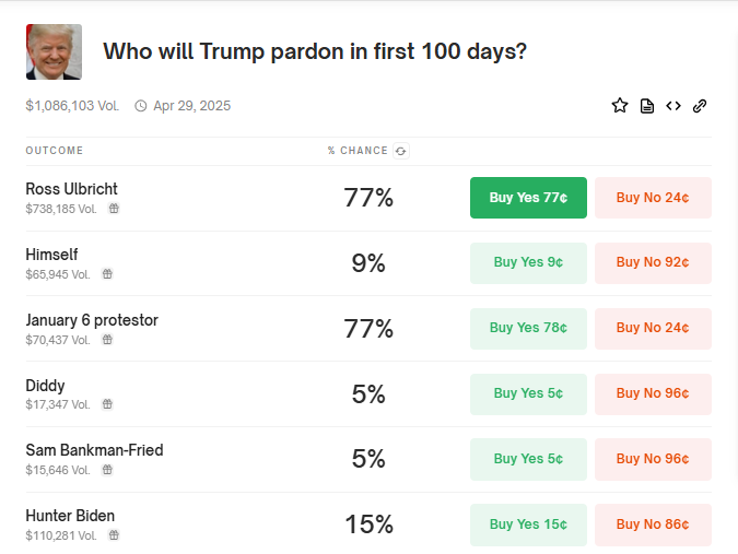 Frågan om Ulbrichts frigivning har även nått Polymarket, en plattform för förutsägelser där användare satsar på politiska och samhälleliga utfall. Spelare på Polymarket spekulerar nu i en 77% chans att Trump kommer att benåda Ulbricht, vilket gör honom till en av de främsta kandidaterna på Trumps potentiella benådningslista. Han matchar individer kopplade till upploppet den 6 januari, som också har 77% chans.