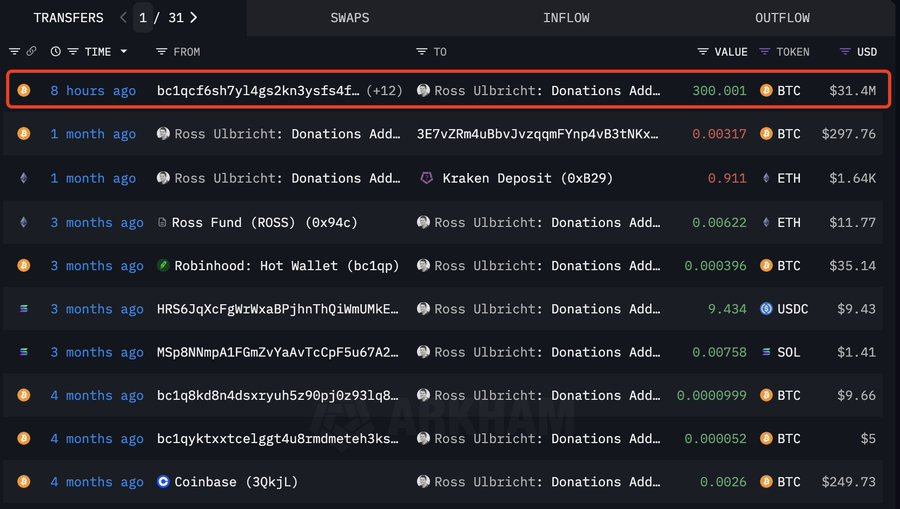 Kort efter auktionen upptäckte blockchain-analysplattformen Lookonchain en betydande donation på 300 BTC, värd cirka 31,4 miljoner USD, som skickades till Ulbricht. Denna transaktion är en av de största enskilda donationerna som registrerats i år.