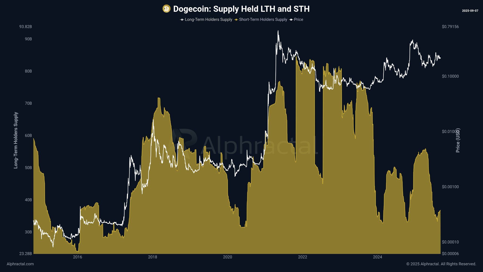 Enligt data från Alphractal visar historiska diagram att Dogecoins STH Supply ökade under 2017 och 2021. Dessa perioder sammanföll med explosiva bullmarknader, när DOGE-priserna mångdubblades.