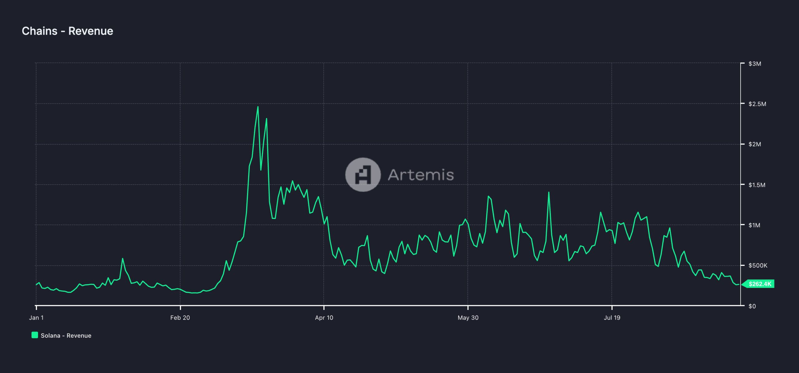 Solanas dagliga intäkter har varit på en nedåtgående trend sedan den 1 augusti, med en minskning på 46% under de senaste 30 dagarna, vilket är den lägsta nivån sedan den 5 mars. Denna nedgång beror till stor del på minskad efterfrågan på Solana, vilket syns i dess minskande on-chain-aktivitet.