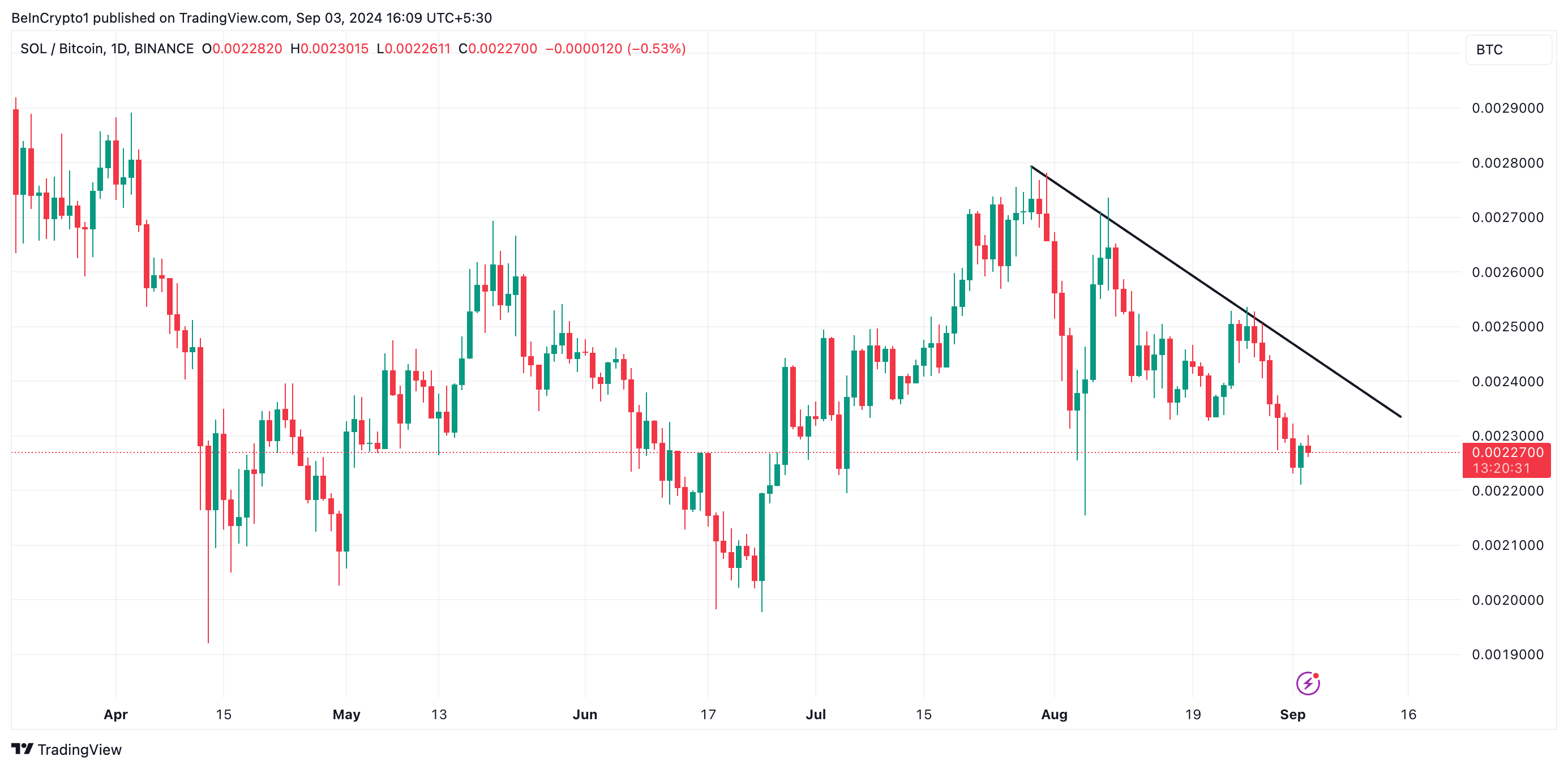 SOL/BTC-handelsparet har varit på nedgång sedan den 31 juli, som visas på ett-dagsdiagrammet. Detta par representerar växelkursen mellan Solana (SOL) och Bitcoin (BTC). Enligt senaste data står växelkursen på 0,002.