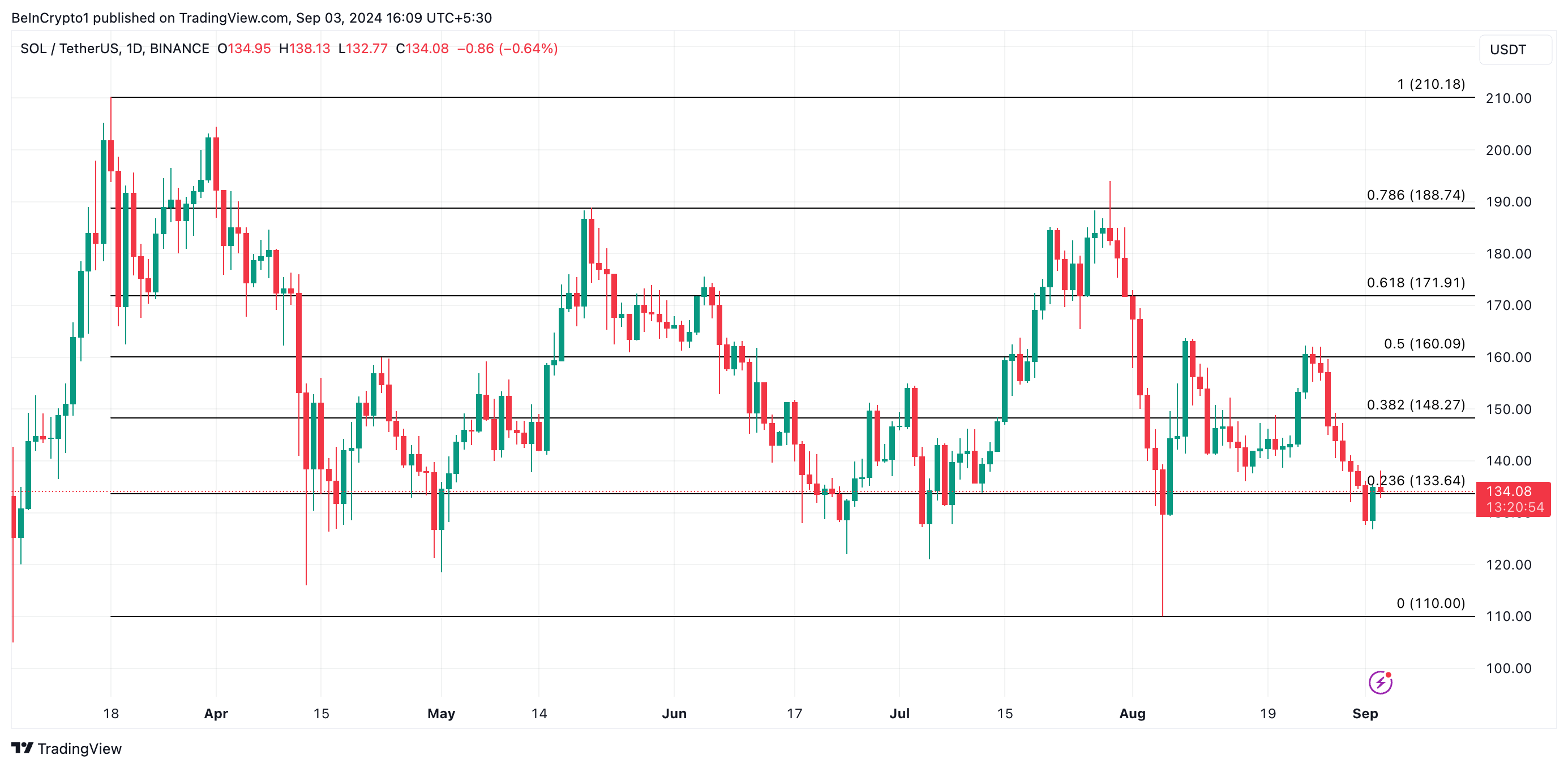 Om SOL:s värde fortsätter att sjunka, kan det potentiellt återvända till sitt lågvärde den 5 augusti på 110 USD, vilket skulle innebära en minskning med 17% från dess nuvarande värde.