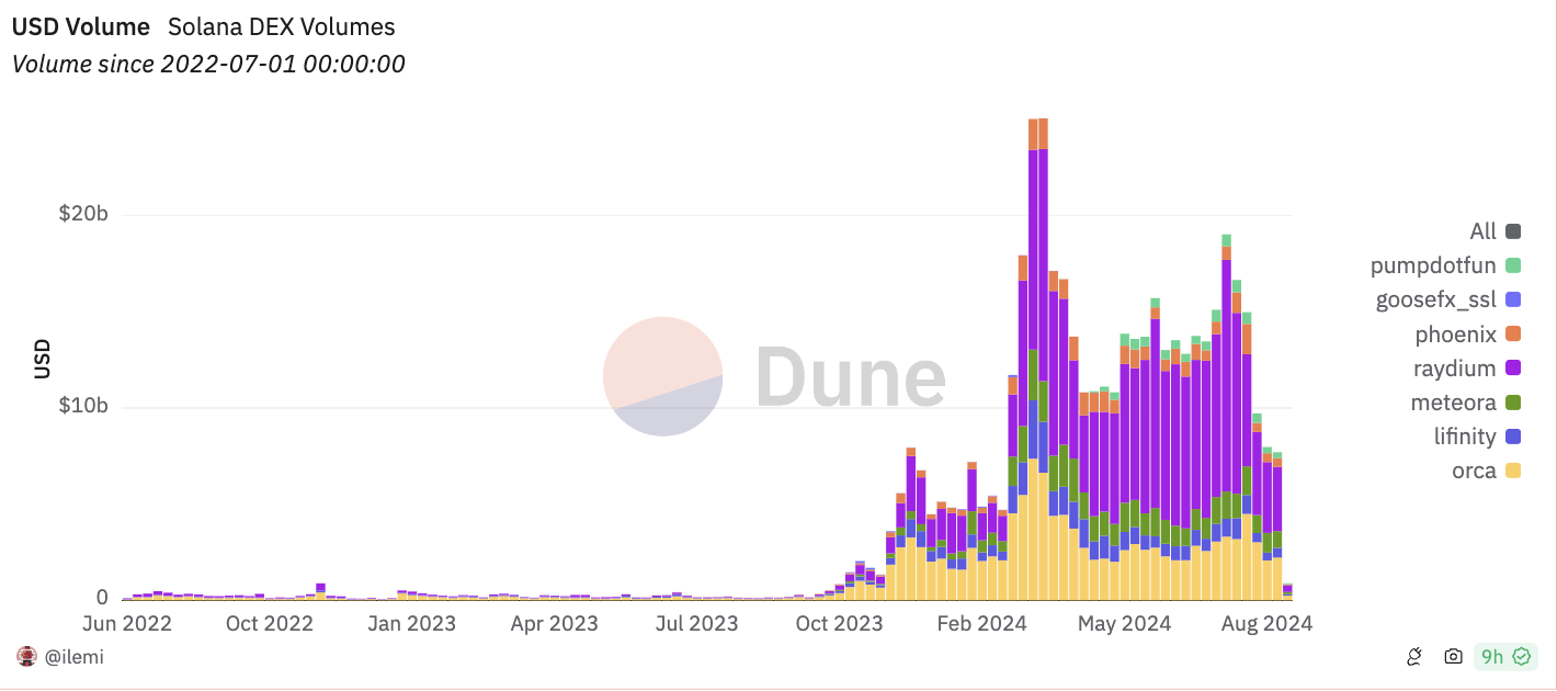 Minskningen i användaraktivitet återspeglas också i Solanas DEX-volym, som nådde en sexmånaderslägsta på 7,7 miljarder USD förra veckan, enligt Dune Analytics. Dessutom återspeglas nedgången i Solanas aktivitet i dess NFT-försäljningsvolym. Data från CryptoSlam visar att Solanas NFT-försäljningsvolym i augusti uppgick till 79 miljoner USD, vilket är en minskning med 24% i månatliga försäljningar på nätverket.