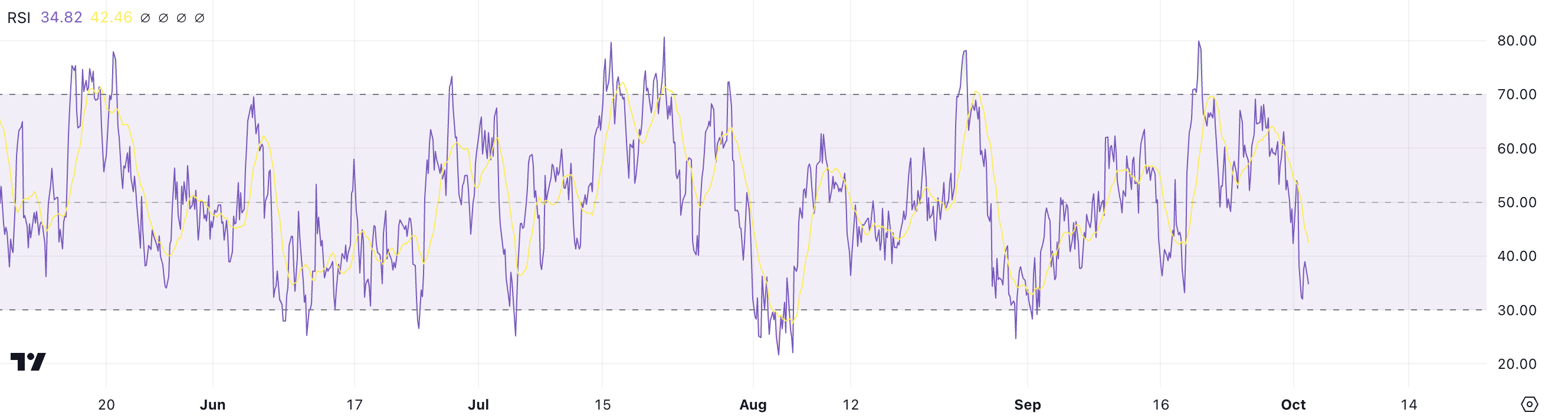 SOL har för närvarande ett RSI på ungefär 34,82, en märkbar minskning från cirka 70 bara femton dagar tidigare. Detta betydande fall indikerar en viktig förändring i marknadssentimentet, från en haussefas där köppress var dominerande till en mer baisseartad utsikt präglad av ökad säljaktivitet. RSI är en teknisk indikator som används för att mäta momentum och hastigheten på prisrörelser.