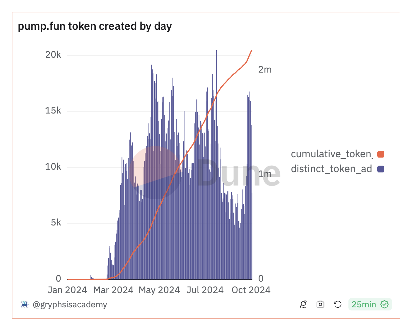 Den 13 augusti nådde antalet unika tokenar som lanserades på PumpFun en rekordhög nivå på 20 465 men upplevde sedan ett dramatiskt fall, till bara 4 629 den 14 september.