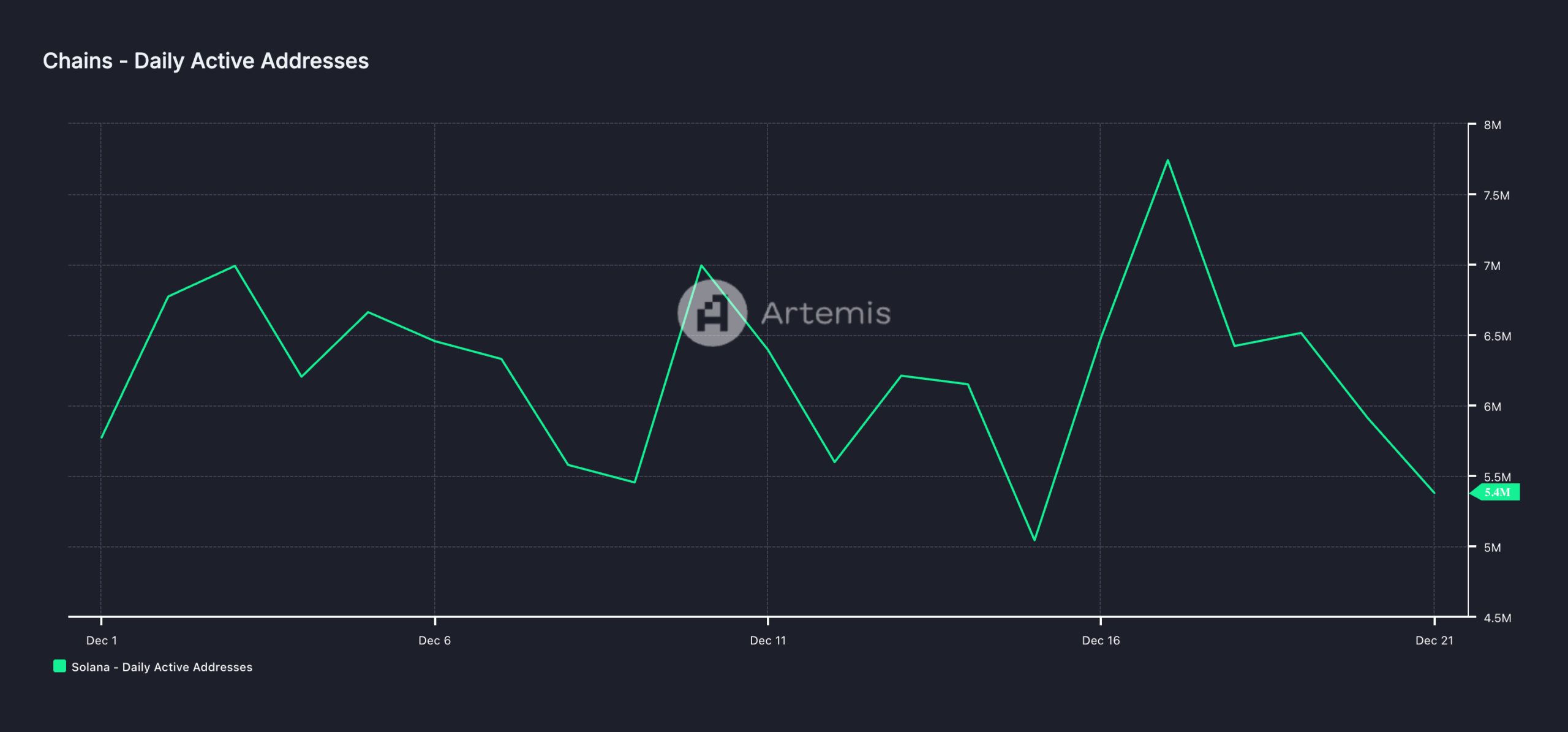 Dessutom har Solanas låga användning lett till minskade nätverksintäkter. Denna minskning har förvärrats av SOL:s prestation, med ett värde som sjunkit med 28 % under de senaste 30 dagarna. Enligt Artemis data har nätverkets intäkter sjunkit med 24 % sedan december började.