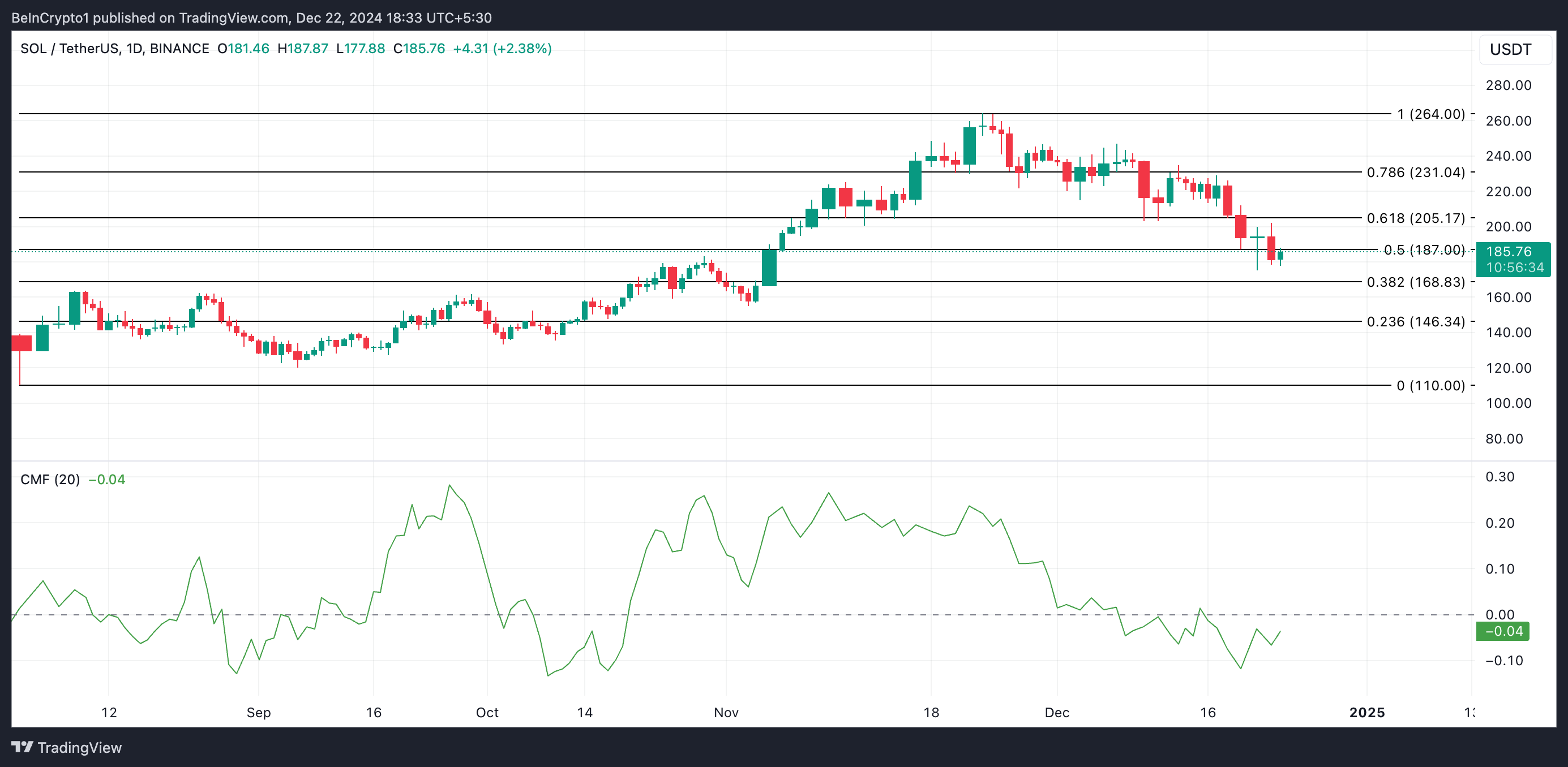 En bedömning av SOL/USD:s endagsdiagram har avslöjat myntets negativa Chaikin Money Flow (CMF), vilket bekräftar dess låga efterfrågan. Vid skrivande stund är denna indikator på -0,04.