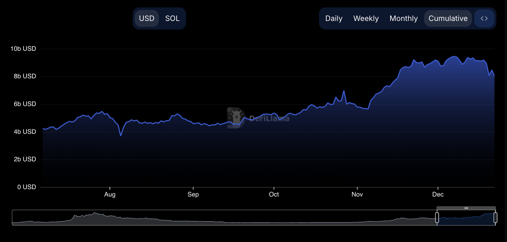 Enligt DeFiLlama ligger Solanas totala låsta värde (TVL) nu på 8,01 miljarder USD, vilket motsvarar en minskning med 12 % sedan 1 december, vilket innebär att 1,1 miljarder USD har lämnat ekosystemet. Nätverkets ledande DeFi-protokoll, Jito, har drabbats särskilt hårt och noterat en 28 % minskning i TVL under den senaste månaden. Vid skrivande stund är Jitos TVL 2,66 miljarder USD.