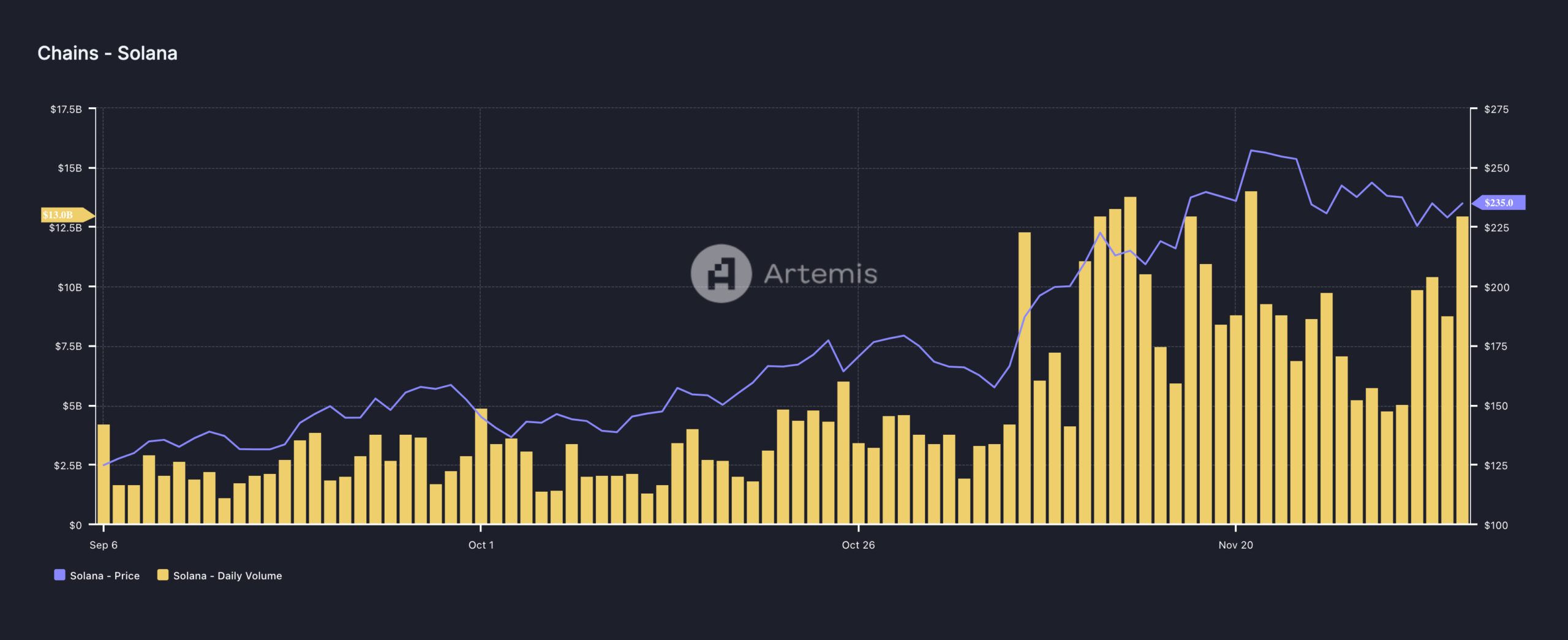 Enligt Artemis data var senaste gången Solanas dagliga volym översteg 13 miljarder USD den 22 november. Intressant nog sammanföll den dagen med SOL:s uppgång till ett nytt rekordhögt pris. Volymen visar i monetära termer hur mycket kryptovaluta som har handlats under en viss period.