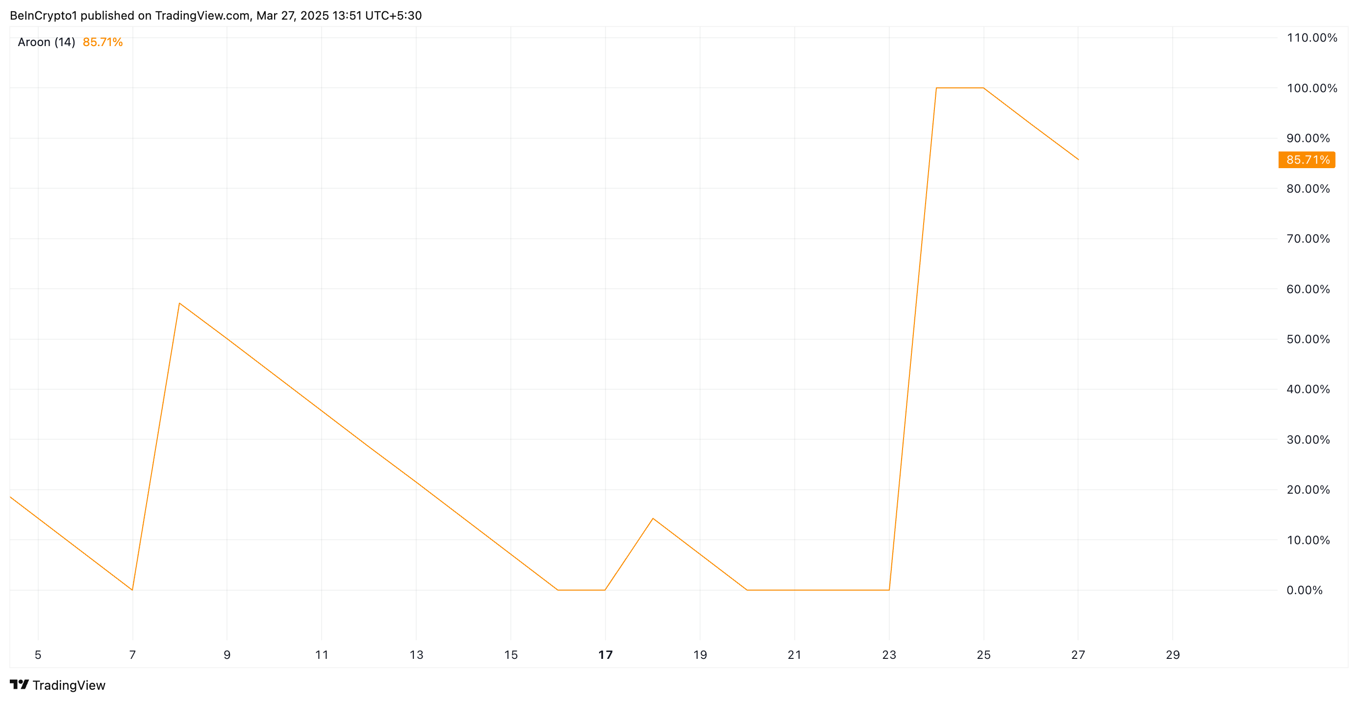 Aroon-indikatorn mäter styrkan och riktningen av en trend genom att spåra tiden sedan de högsta och lägsta priserna inträffade. När en tillgångs Aroon Up-linje är nära 100 %, signalerar det en stark uppåtgående trend, vilket indikerar att den nyligen har nått nya toppar och har uppåtgående momentum.