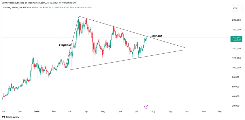 Om denna trend håller i sig kommer SOL att bryta över den övre linjen i det hausseartade vimpelmönstret. Den kommer att byta händer vid $164,51 och stiga mot $170.
