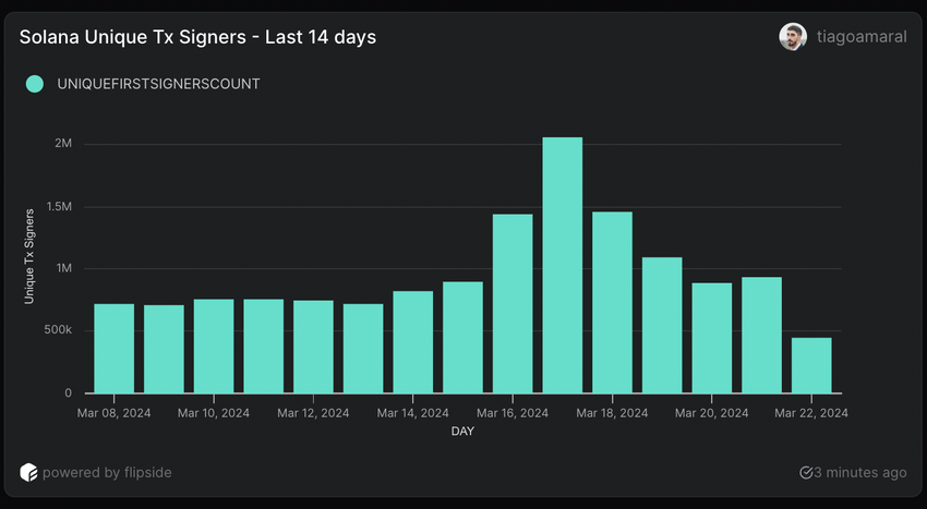 Sedan januari 2024 har denna siffra visat en stadig ökning. Den 8 mars nådde mätvärdet 717,000 17 användare, och den XNUMX mars ökade det till mer än 2,000,000 178.94, vilket markerade en XNUMX% ökning på mindre än tio dagar. Men efter att Solana nått mer än 2 000 000 unika användare på en enda dag började antalet dagliga undertecknare att sjunka och nådde 936 000 den 21 mars.