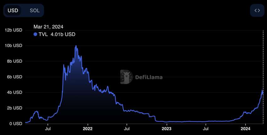 Det totala låsta värdet (TVL) inom Solana-ekosystemet har nyligen uppnått en betydande milstolpe och överträffat 4 miljarder dollar för första gången sedan april 2022.