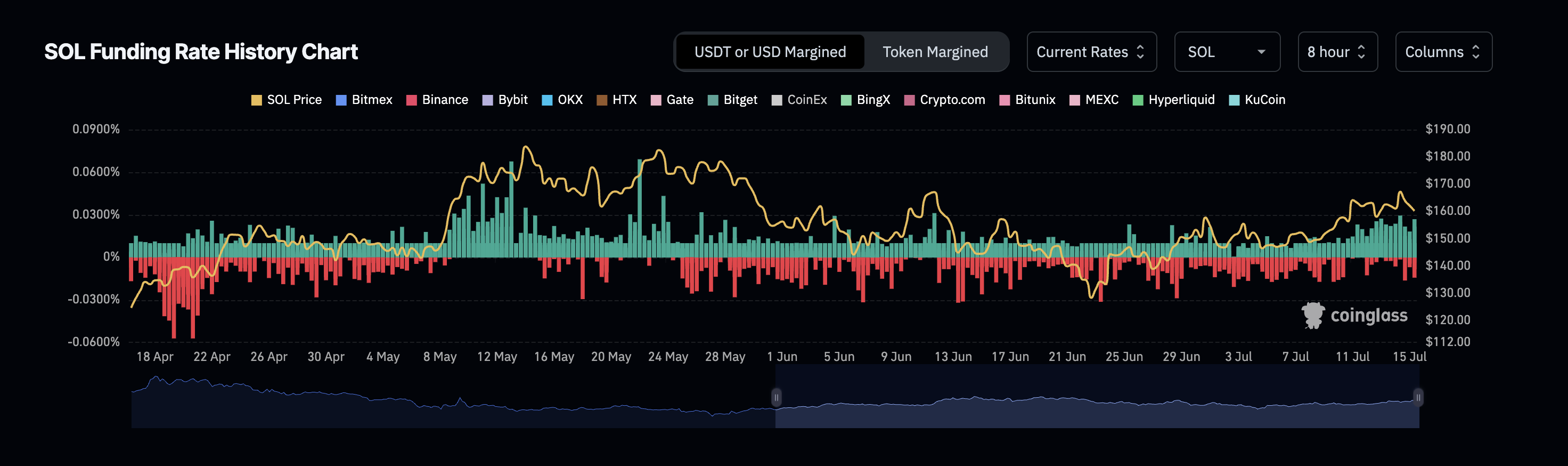 Solanas finansieringsräntor är fortfarande gröna, vilket visar att långa positioner dominerar marknaden. Även om priset sjönk något, betalar handlare fortfarande en avgift för att hålla långa positioner, vilket betyder att de flesta förväntar sig att priset stiger igen.