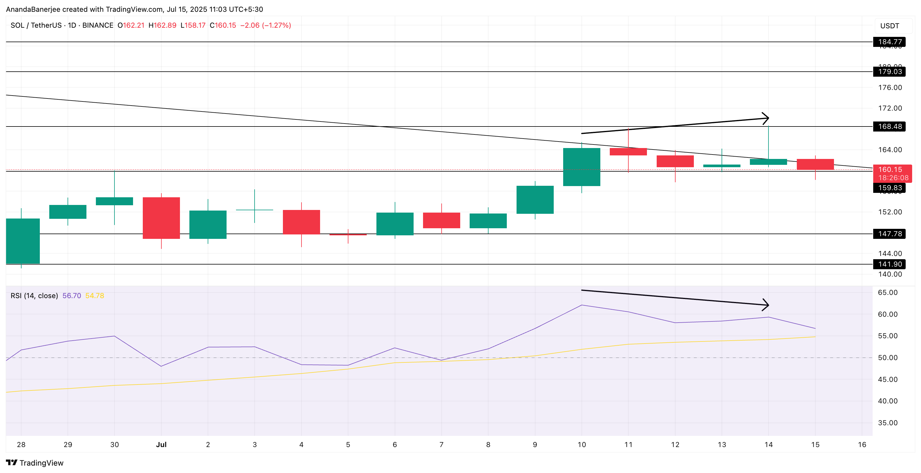 Solanas pris kan svalna från sin senaste topp på 168 USD, men den större strukturen gynnar fortfarande köpare.