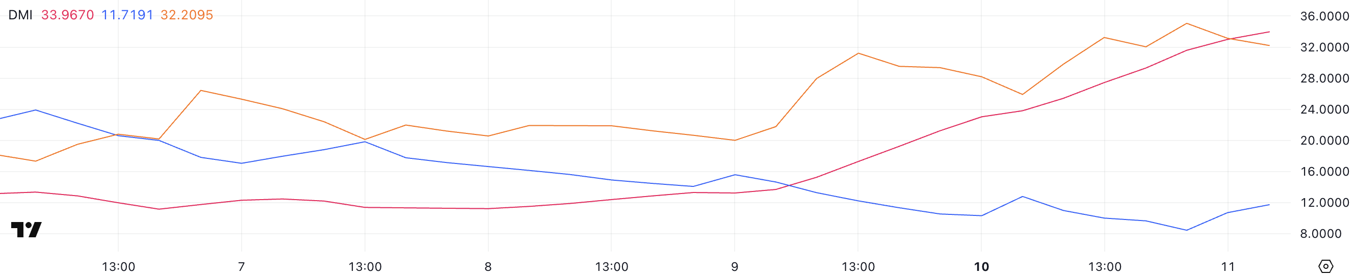 +DI (positiv riktning) har sjunkit till 11,71 från 15,5 för två dagar sedan men har återhämtat sig något från 8,43 igår. I kontrast ligger -DI (negativ riktning) på 32,2, upp från 25,9 för två dagar sedan, men något ner från 35 för några timmar sedan.