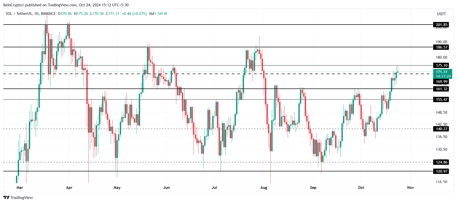 Solana står för närvarande inför motstånd vid 175 USD, en nivå den inte närmat sig på nästan tre månader. Efter att ha lyckats bryta igenom 161 USD-gränsen för första gången sedan augusti visar altcoinen tecken på styrka. Dock kan marknadens sårbarhet för en nedgång inte ignoreras. En potentiell nedgång skulle kunna skicka Solana tillbaka till dess kritiska stödnivå på 161 USD.