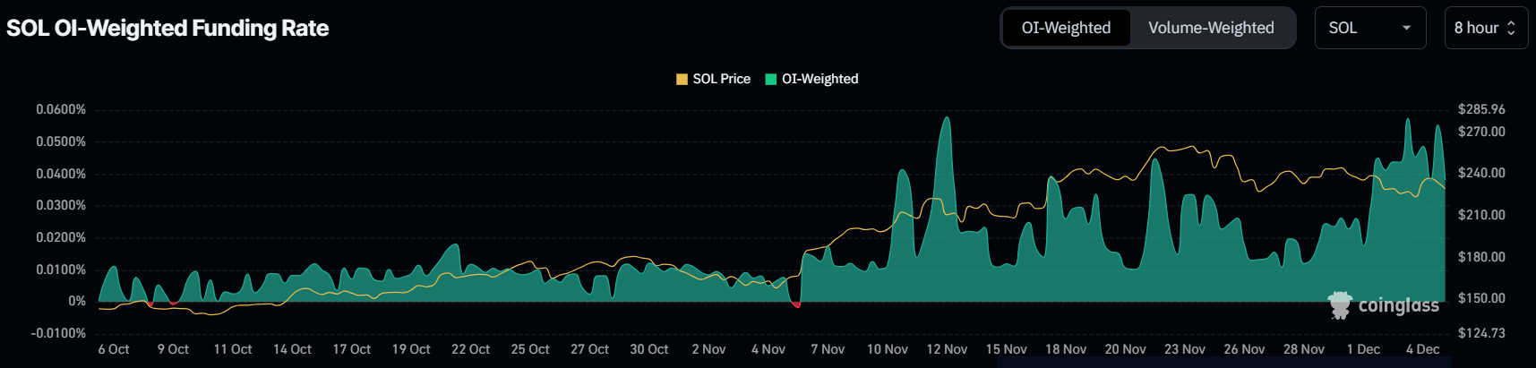 Finansieringsräntan för Solana är för närvarande mycket positiv, vilket är en viktig indikator på en optimistisk marknad. En positiv finansieringsränta visar att handlare är villiga att betala för att behålla sina långa positioner, vilket speglar optimism för Solanas prisutveckling.