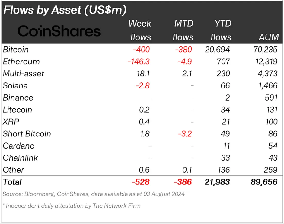 Enligt CoinShares-rapporten tog institutionella investerare ut över 528 miljoner dollar från kryptotillgångar under veckan som slutade den 3 augusti. Även om det mesta kom från Bitcoin (BTC), registrerade Solana också utflöden till ett värde av 2,8 miljoner dollar.
