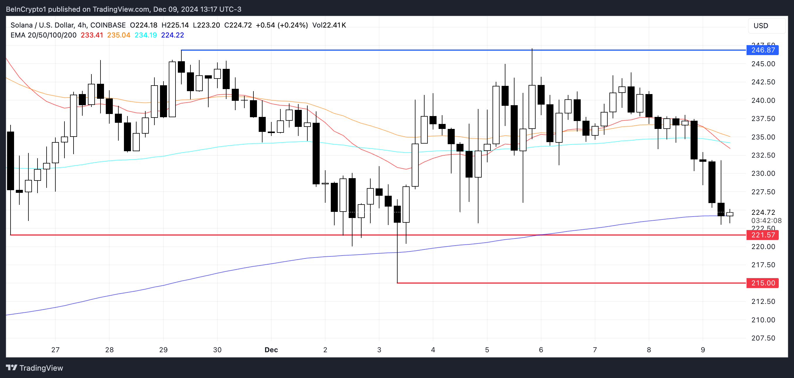 Om denna trend fortsätter kan Solana-priset testa stödet vid 221 USD, och om den nivån inte håller kan priset sjunka så lågt som 215 USD.