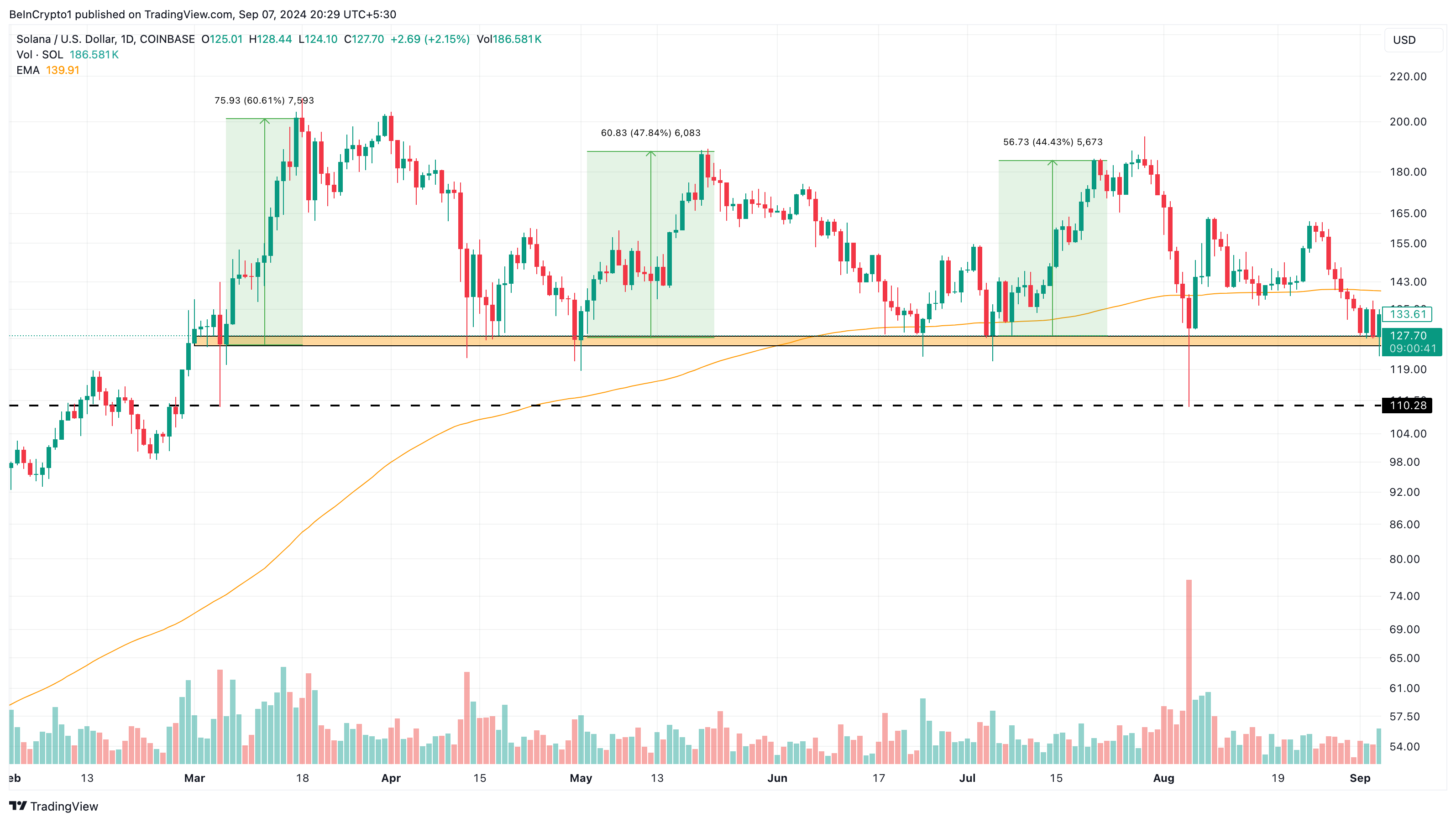 Enligt det dagliga diagrammet har 127 USD-regionen fungerat som en viktig stödnivå för Solana minst tre gånger i år. I mars, till exempel, studsade Solanas pris från 127 USD till 200 USD efter att tjurarna försvarade stödet.
