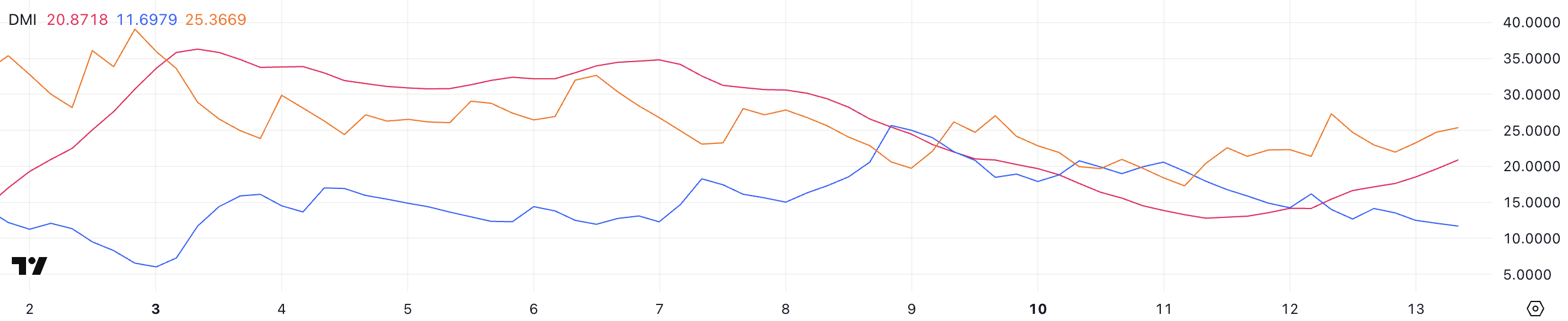 Solana DMI-diagram visar att dess ADX för närvarande är på 20,8, upp från 12,7 för bara två dagar sedan. Denna ökning tyder på att trendstyrkan börjar byggas upp efter en period av relativt låg momentum.