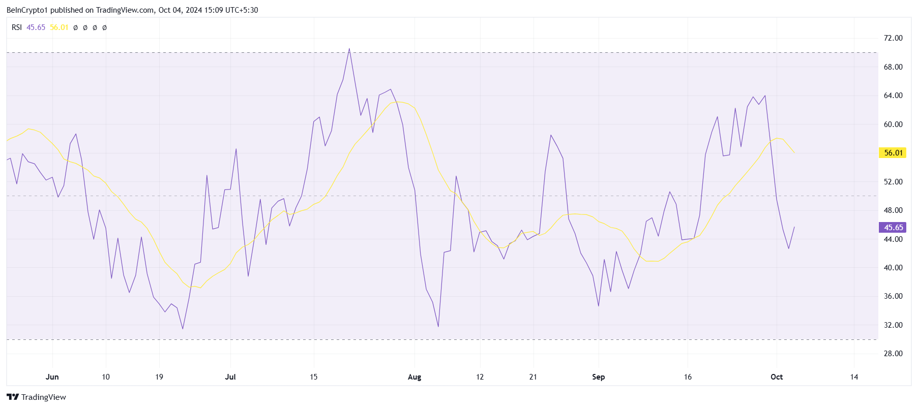 För närvarande pekar makromomentumet för Solana mot en negativ utsikt, som återspeglas i viktiga tekniska indikatorer. Relativa styrkeindexet (RSI) har fallit under den neutrala linjen på 50,0, vilket signalerar ökande negativt momentum. RSI:s position i den negativa zonen tyder på att säljtrycket har intensifierats, med få tecken på en snar vändning.