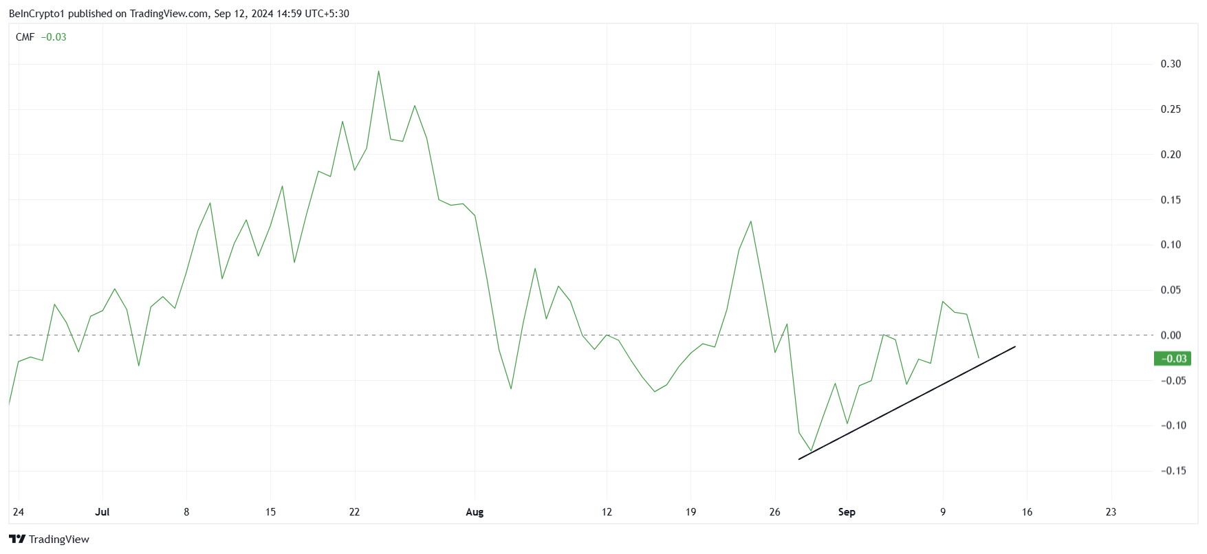 För att rallyt ska få fullt genomslag måste CMF korsa över noll-linjen. När detta sker skulle det signalera att nettoflödena har blivit positiva, vilket stärker förtroendet för Solanas prisåterhämtning.