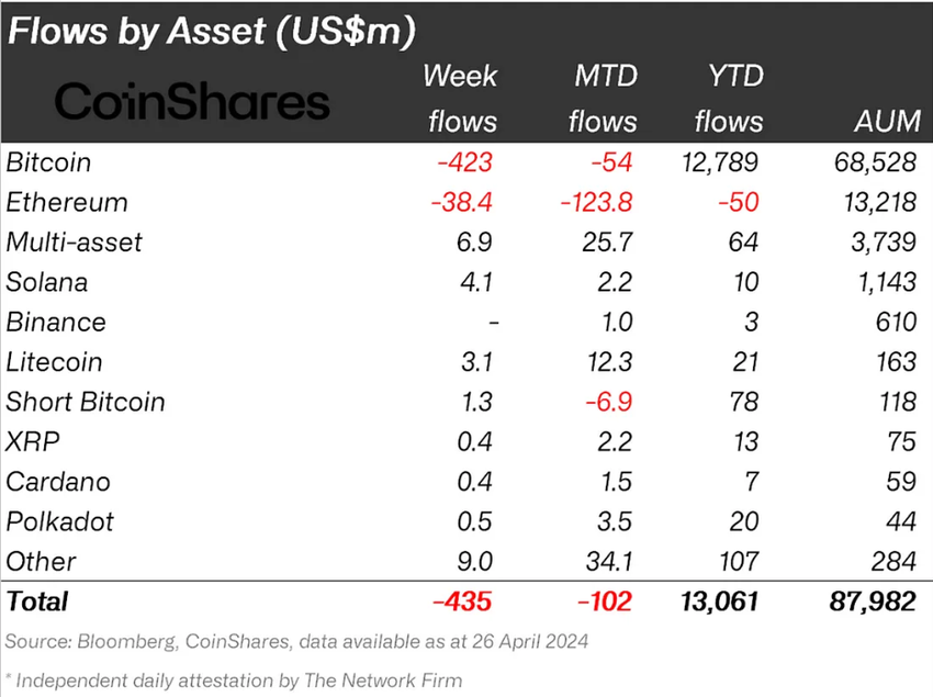 Under de senaste dagarna verkar SOL ha återfått stödet från institutionella investerare, som det hade förlorat sedan början av året. Enligt CoinShares veckorapport observerade “Ethereum-dödaren” inflöden på 4,1 miljoner dollar för veckan som slutade den 26 april.