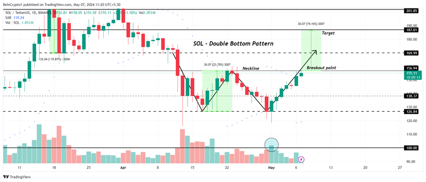 Det dubbla bottenmönstret är en hausseartad vändningssignal som bildas av två på varandra följande dalar, vilket tyder på en potentiell övergång från en nedåtgående trend till en uppåtgående trend. Baserat på mönstret är det troliga målet för SOL: s uppsida på $ 187.