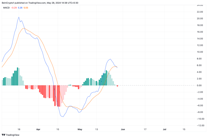 Bekräftar skiftet i marknadstrenden från hausseartad till baisseartad, avläsningar från SOL: s Moving Average Convergence Divergence (MACD) visade att MACD-linjen har korsat signallinjen i en nedåtgående trend.