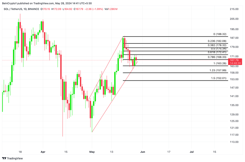 SOL:s rörelse i en stigande kanal började när den initierade en uppåtgående trend den 30 april. Den dagen handlades altcoin till 129 dollar. Den 20 maj hade dess värde stigit till en topp på 184 $, varefter försäljningsaktiviteten började.
