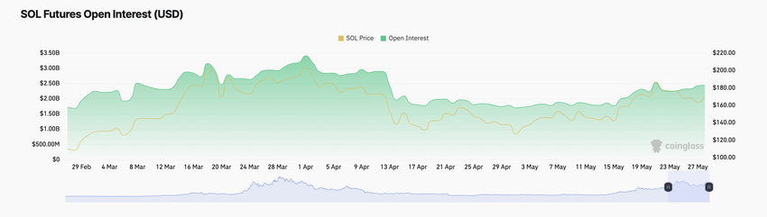 SOL har bevittnat en nedgång i öppet intresse på sin terminsmarknad sedan 20 maj. Vid 2.44 miljarder dollar vid presstid har detta kraterat med 4% under de senaste sju dagarna.