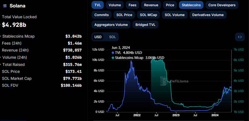 Volymen av stablecoin-inflöden till Solana-nätverket har nått 1,5 miljarder dollar sedan december 2023, visar DefiLlama-data. Under denna period har SOL-priset ökat med 246% till 173 $ i skrivande stund. Det nuvarande värdet av stablecoins på Solana är 3.04 miljarder dollar, medan det totala värdet låst (TVL) ligger på 4.92 miljarder dollar.