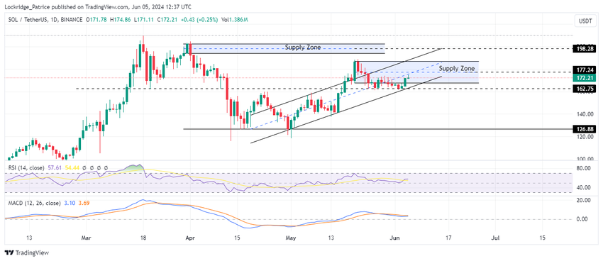 Solana-priset handlas med en hausseartad bias och håller sig inom ramen för en stigande parallellkanal. Det står inför omedelbart motstånd på grund av den genomsnittliga tröskeln på $ 177,24. Detta är mittlinjen i utbudszonen, som sträcker sig från $167,78 till $187,01.