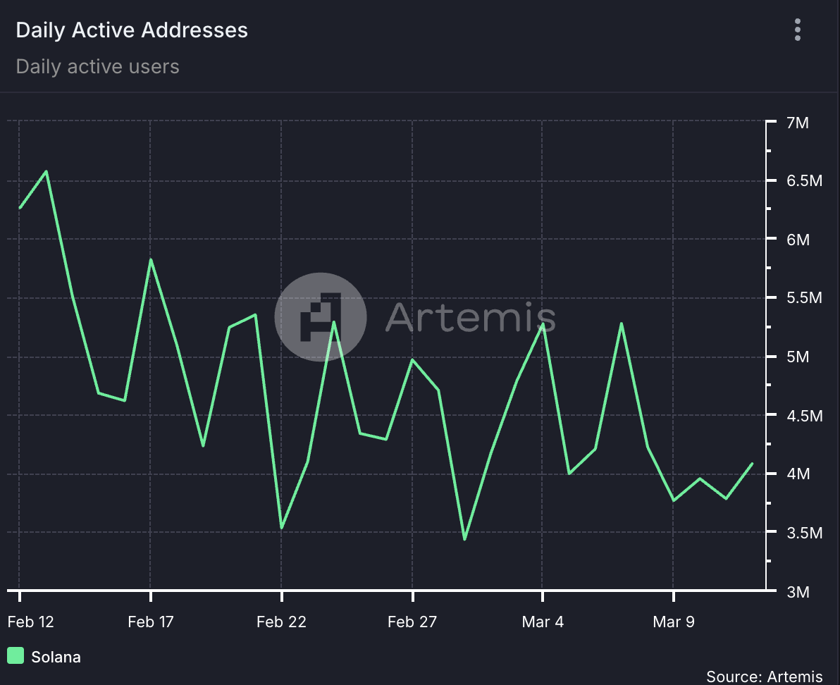 Under den senaste månaden har det dagliga antalet adresser som har genomfört minst en transaktion på Solana-nätverket minskat med 35 %. Enligt Artemis har endast 4,08 miljoner adresser besökt Layer-1-nätverket de senaste 30 dagarna.