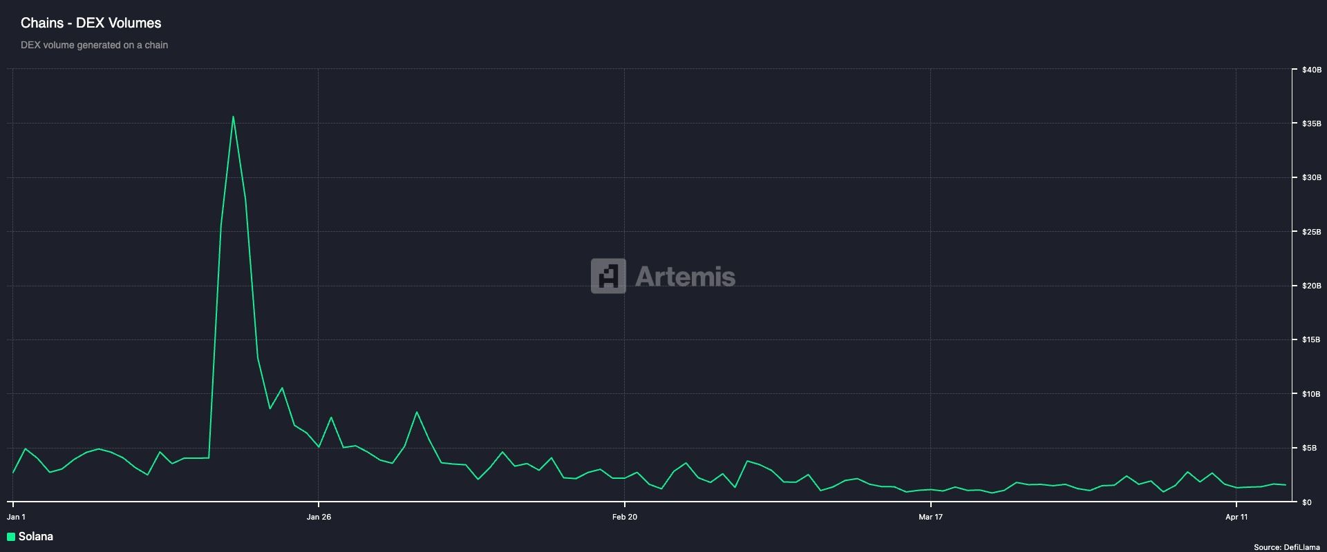 Till exempel, SOL:s DEX-volym nådde ett rekordhögt 36 miljarder USD den 19 januari. Men när meme-mynt hypen svalnade, hade den den 31 januari sjunkit till bara 3,8 miljarder USD, en minskning med nästan 90 %. Den 15 april uppgick den till 1,5 miljarder USD.