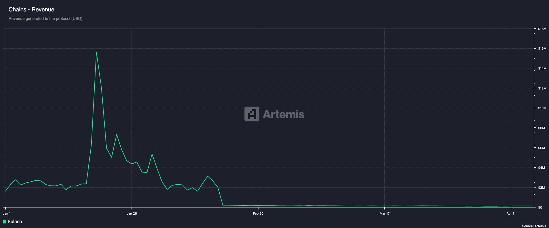 Solanas nätverksintäkter skonades inte. Dagliga intäkter, som steg till ett rekordhögt 16 miljoner USD den 19 januari, sjönk till under 5 miljoner USD i slutet av januari. Igår var nätverkets totala intäkter från alla genomförda transaktioner under 115 000 USD.