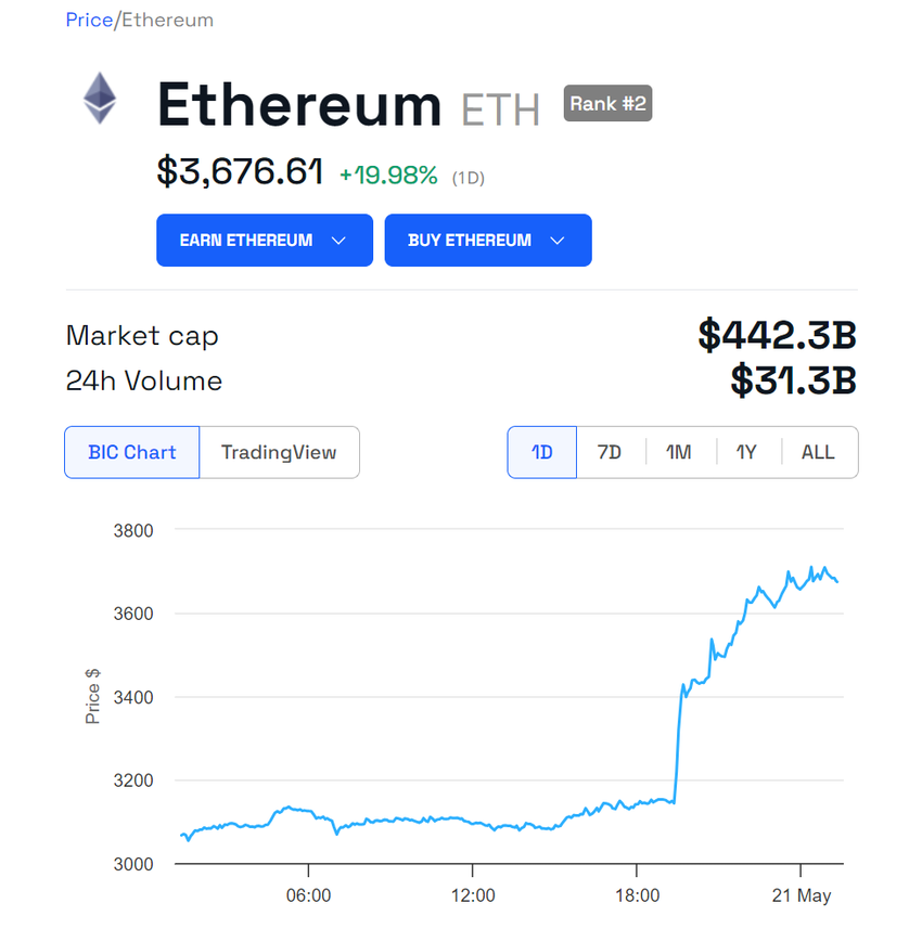 Efter denna nyhet har Ethereums (ETH) pris ökat avsevärt. Enligt BeInCryptos data har ETH:s pris stigit med 19,98% under de senaste 24 timmarna. I skrivande stund handlas ETH nu till 3 676 USD.