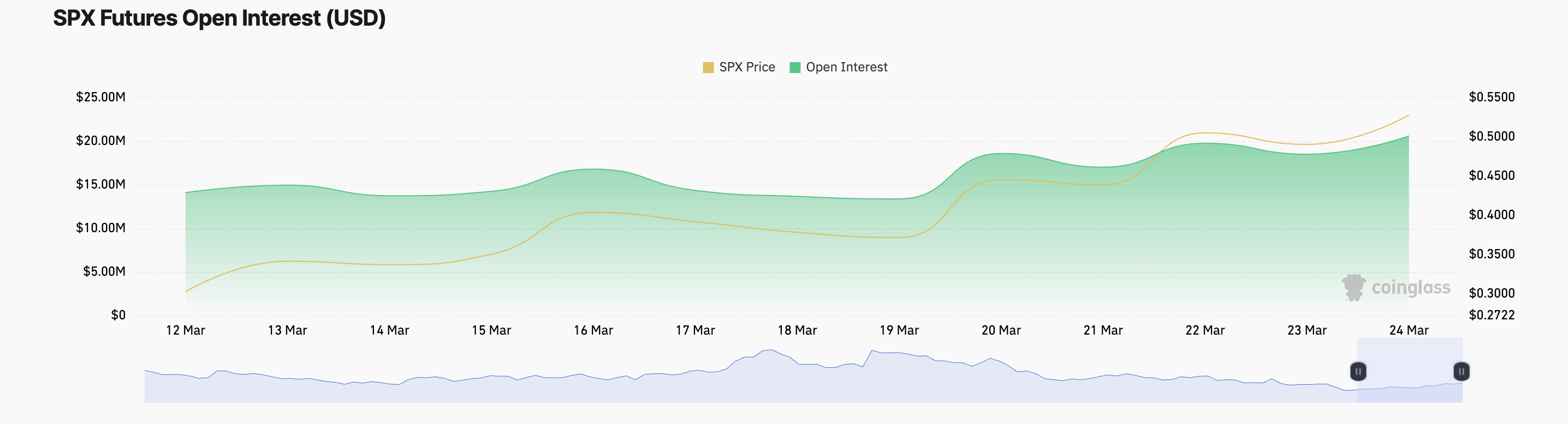 Vidare stöder SPX:s ökande Open Interest (OI) denna positiva utsikt. Den ligger för närvarande på 21 miljoner USD, en ökning med 50 % sedan tokenen gjorde en återhämtning från sin rekordlåga nivå den 11 mars.