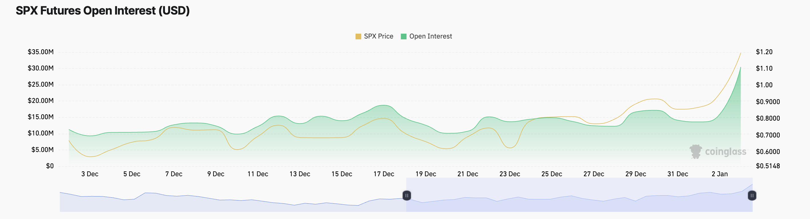 Ökningen i aktivitet kring SPX återspeglas i dess stigande öppna intresse, som nu ligger på ett rekordhögt värde av 30,46 miljoner USD. Enligt Coinglass har detta ökat med 90 % under de senaste 24 timmarna.