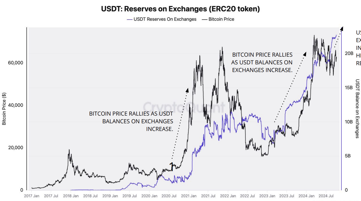 Tillväxten av dessa tillgångar på centraliserade börser är särskilt betryggande för marknaderna. Stablecoins används ofta som mellanhänder för köp av Bitcoin på kryptobörser, och deras likviditetstillväxt korrelerar positivt med prisökningar på Bitcoin.