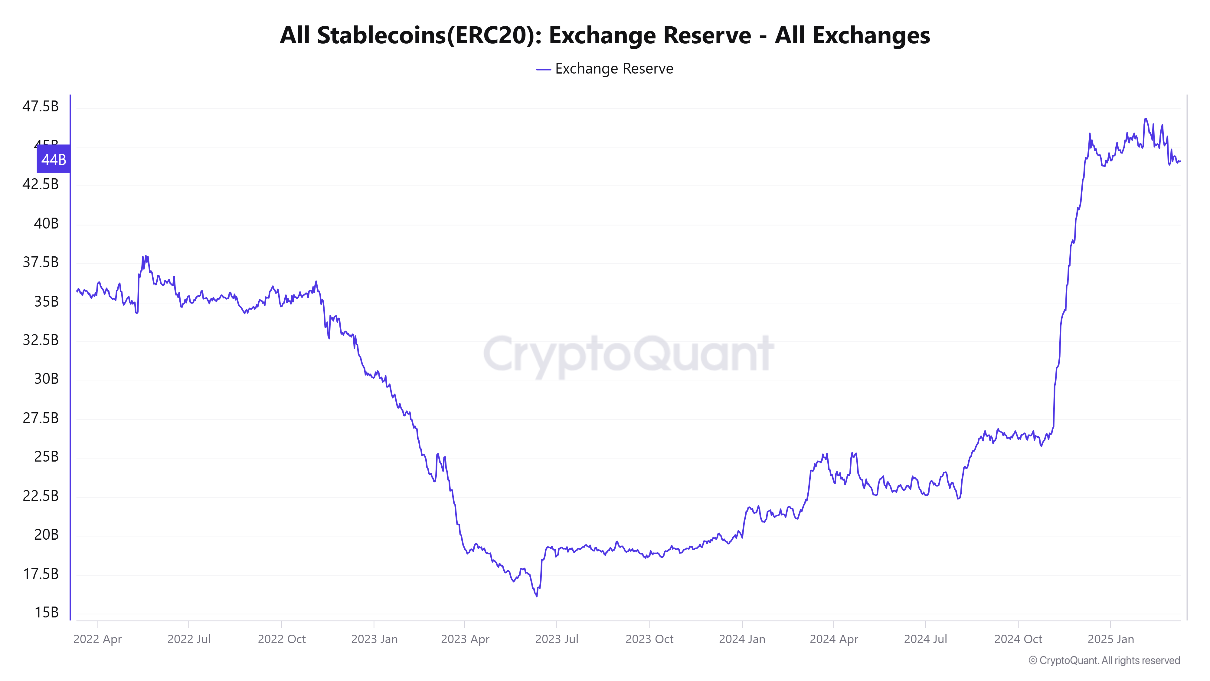 Enligt CryptoQuant nådde det totala värdet av ERC-20 stablecoins på börser 46,5 miljarder USD i början av 2025. Just nu ligger denna siffra på 44 miljarder USD. Dessa data har fått investerare som The DeFi Investor att tro att kapitalet är redo att driva en marknadsåterhämtning.