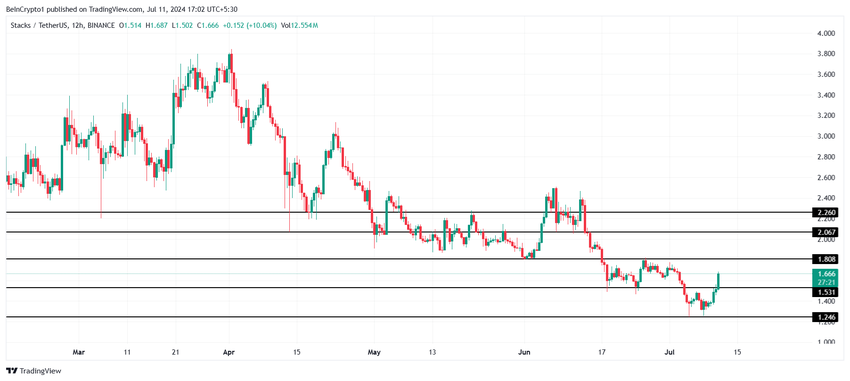 STX-priset markerade en kraftig återhämtning med 19% under de senaste 24 timmarna, vilket pressade altcoinet att handlas till $1,66. Därmed studsade Stacks från stödgolvet på 1,24 dollar och försökte nu stiga till 1,80 dollar.