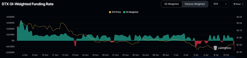 Tvärtom har STX:s finansieringsränta upplevt en anmärkningsvärd nedgång och blivit negativ. Finansieringsräntan, som är den kostnad som uppstår för att inneha en position i ett terminskontrakt, indikerar vanligtvis balansen mellan långa och korta positioner. En negativ finansieringsränta tyder på att korta kontrakt dominerar marknaden.