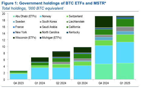 Detta diagram visar de totala statliga innehaven av Bitcoin ETF:er och MicroStrategys MSTR-aktier från Q4 2023 till Q1 2025, mätt i ‘000 (tusen) BTC-ekvivalenter. Enligt diagrammet har innehaven ökat stadigt och nådde en topp i Q1 2025 på cirka 18 000 BTC.