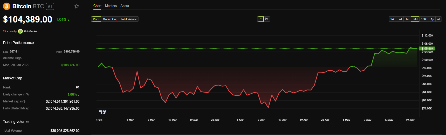 Bitcoin handlades för 105 178 USD, en ökning med 2,27 % de senaste 24 timmarna. Nyligen nådde kryptomarknadens pionjär en rekordhög marknadsvärdering på 2,09 biljoner USD.
