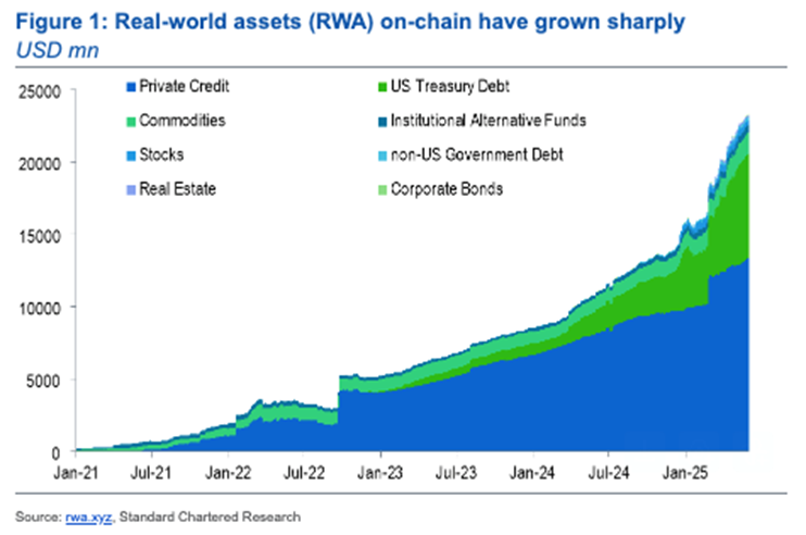 “Tillväxten i icke-stablecoin RWA-tokenisering har släpat efter betydligt. Med 23 miljarder USD är denna marknad för närvarande bara cirka 10 % av storleken på stablecoin-marknaden,” sa Geoff Kendrick, chef för Digital Asset Research på Standard Chartered.