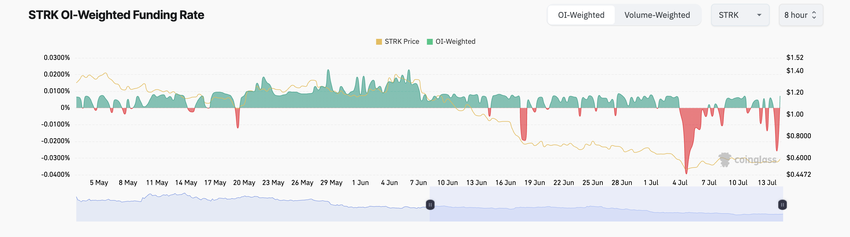 Många derivathandlare är dock inte övertygade om att STRK:s nuvarande rally är hållbart. Detta har fått dem att kräva fler korta positioner. Detta är baserat på avläsningarna från tokens finansieringsränta, som har varit övervägande negativ under den granskade perioden.