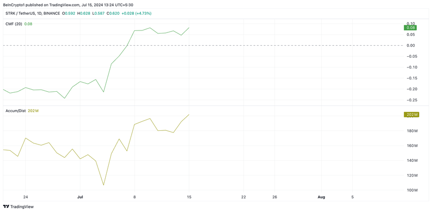 Som bedömt på ett endagsdiagram antyder några av STRK:s ledande tekniska indikatorer möjligheten till ett utökat rally. Till exempel har dess Chaikin Money Flow (CMF) trendat uppåt med priset.